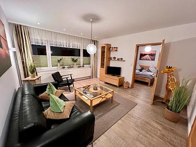 Herzlich willkommen in der Ferienwohnung 4 auf ca. 95 m² Wohnfläche für bis zu 4 Personen. Ein großes Wohn-/Esszimmer mit Ledercouch, TV, DVD und Balkon lädt zum verweilen ein. Der offene Kamin schafft eine gemütliche Atmosp